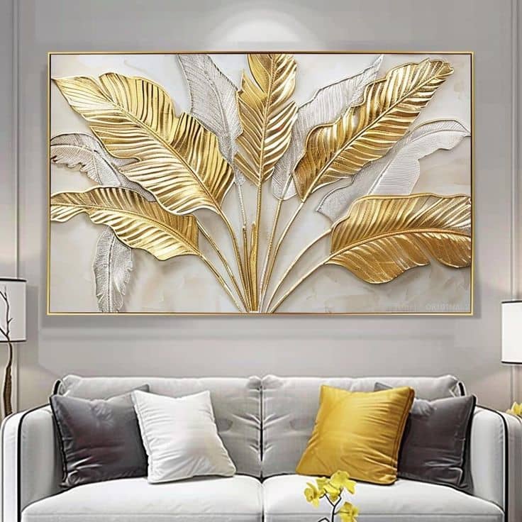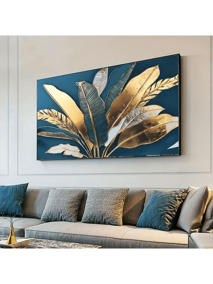 تابلو دکوراتیو برگ موز نقش برجسته کار شده با ورق طلا و رنگ روغن 140*80 و 160*100 کد049۸٬۹۰۰٬۰۰۰ تومان